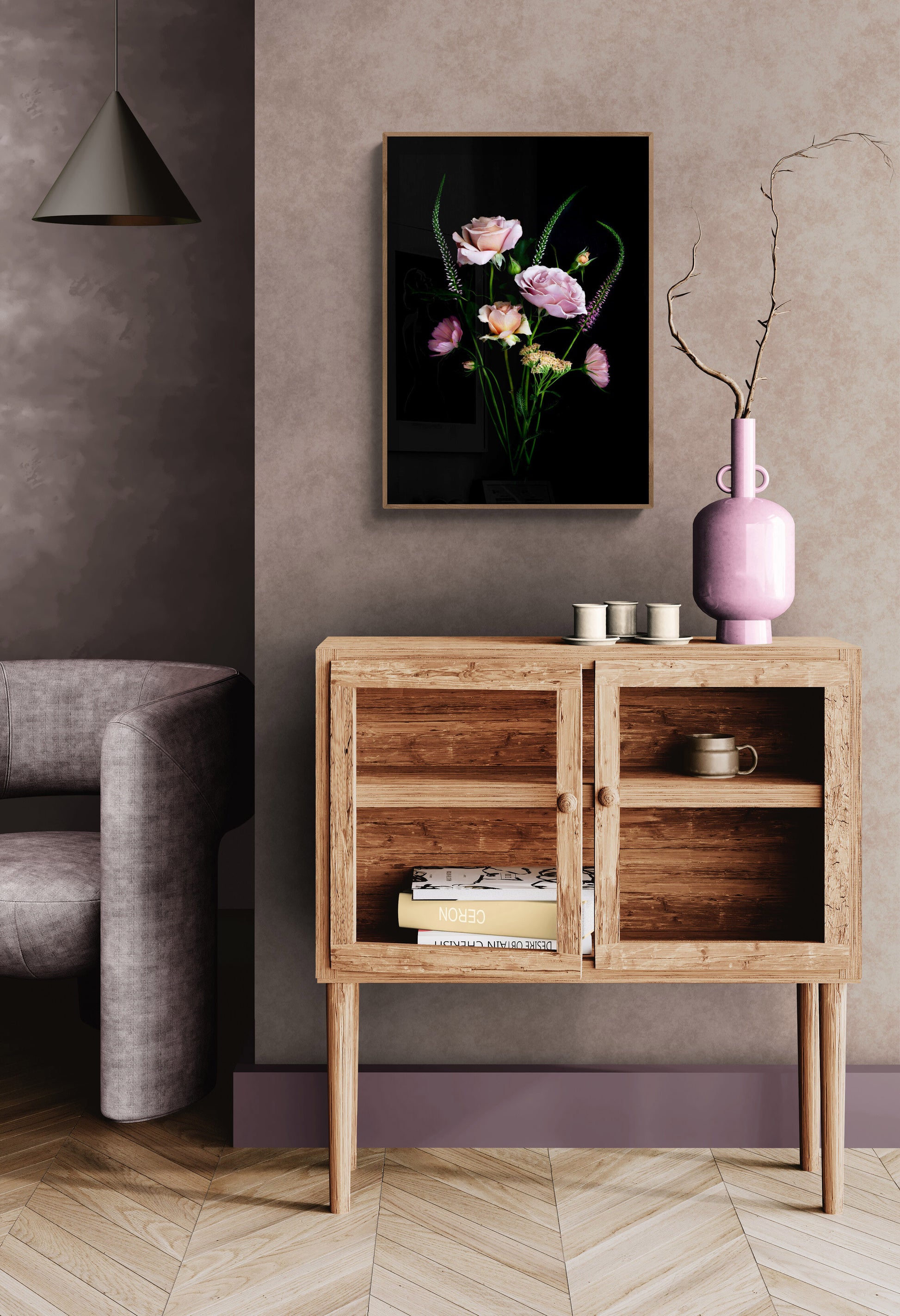 A beautiful little posy of Koko Loco Roses, golden Achillea, coppery Cosmos and a swoosh of Veronica, enhanced by a black background.